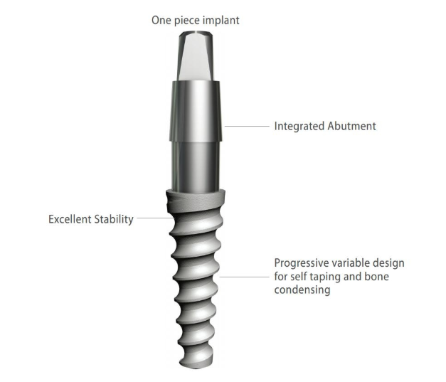 The Solo implant is a one piece titanium implant with an integrated abutment which designed for one stage surgical procedures.
